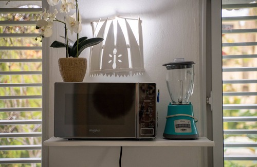 The apartment is located on the ground floor of a small 1-storey building. There is a beautiful terrace perfect for having your meal, resting and chilling, overlooking a tropical garden and the swimming pool. The kitchen and the bathroom have been refurbished with beautiful ceramic which gives it a touch of charm and modernity. The apartment has a comfortable bedroom with a double bed, air conditioning and a ceiling fan. There is a bench that makes a bed in the room for a possible 3rd person.