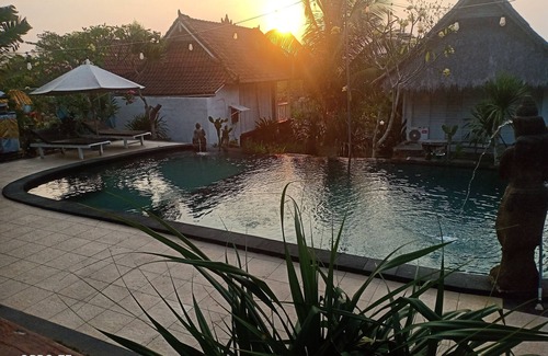 Deluxe bungalow located at nusa ceningan, if from lembongan that must be cross lovely yellow bridge . 5 minute walk to the blue lagoon area and secret point beach. Room offer western style and toiletress. Come with ac and hot water shower.