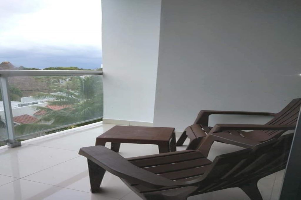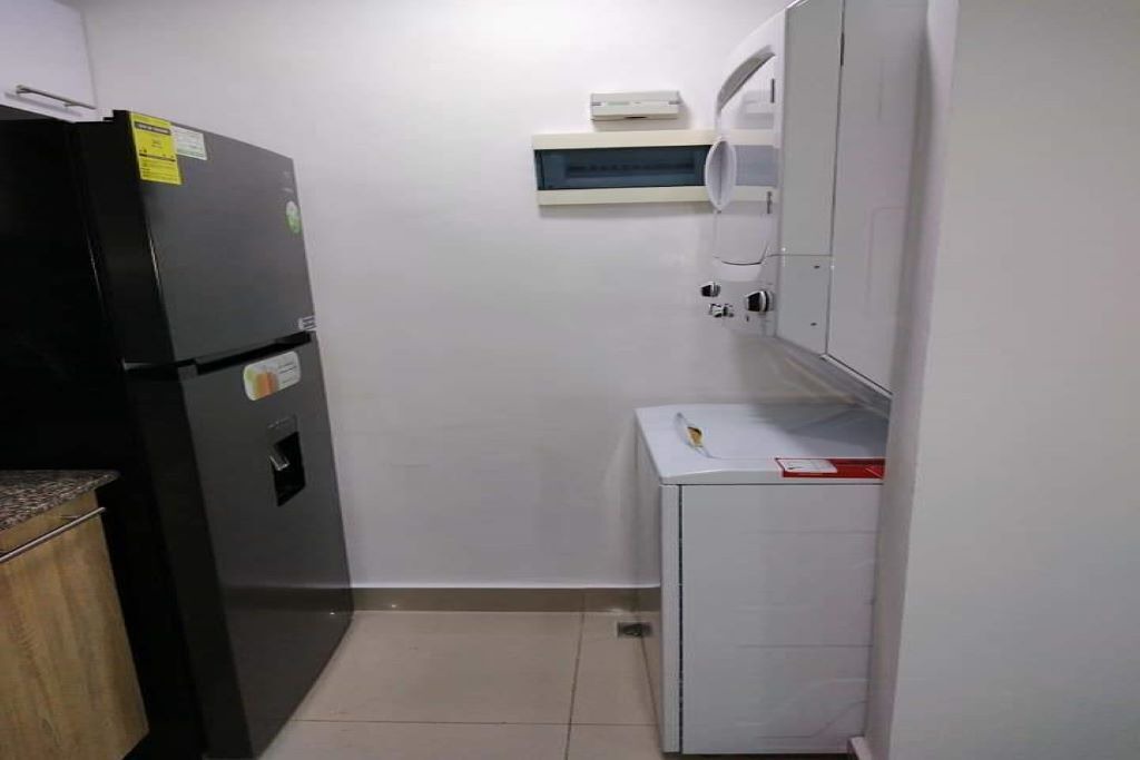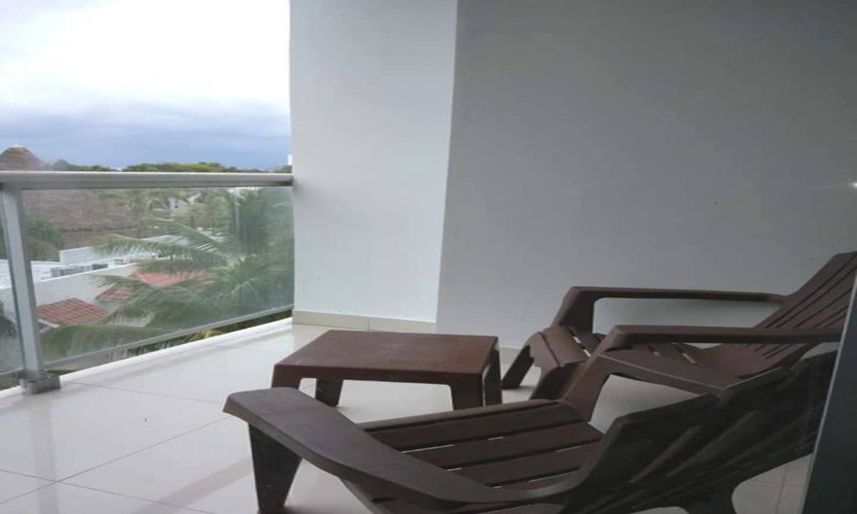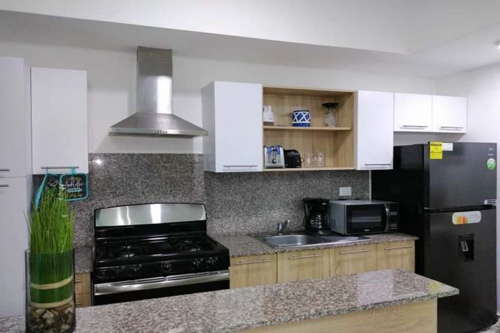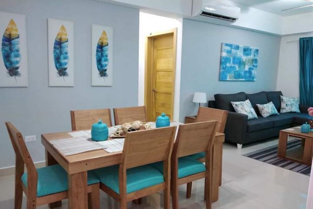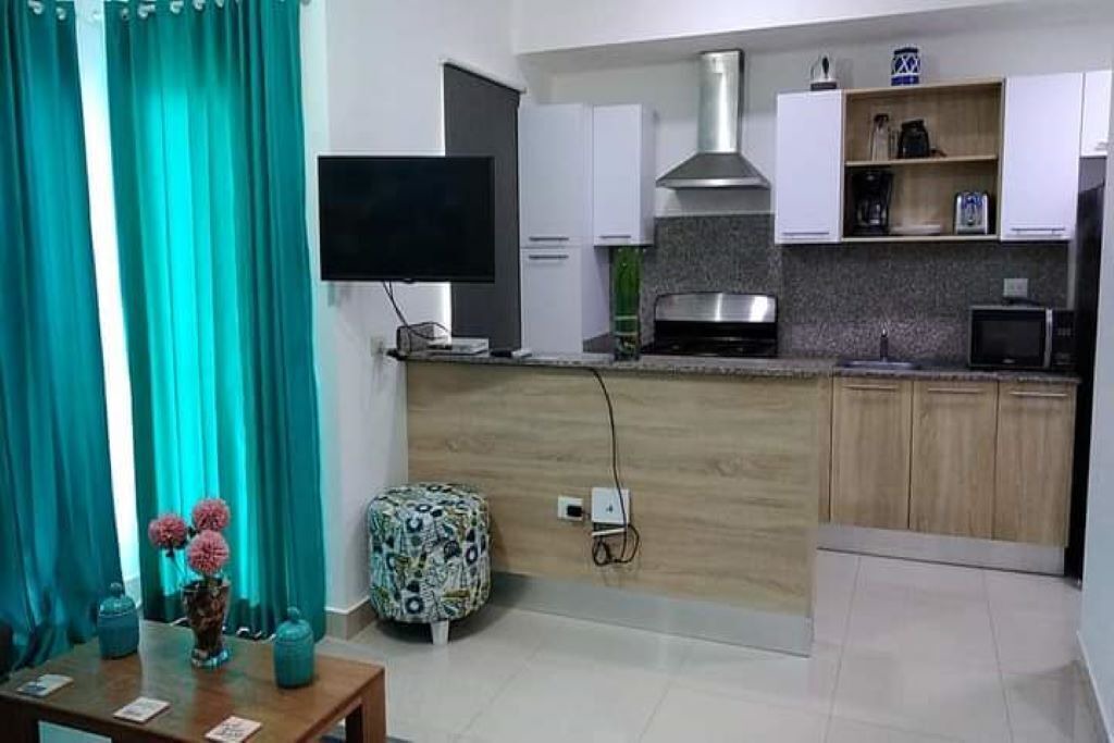 Fully furnished 2 Bdrm Condo w/Bath, Kitchen, L-Rm, D-Room, Balcony, & 12 mins from SDQ airport. Within walking distance of Grocery Store, Restaurants & Beach. Gated parking garage w/ Pool & Gym...