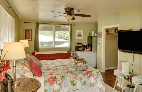 Make your tropical dreams come true at this Keaau vacation rental, perfect for relaxing after a day of sightseeing! This 1-bath studio allows you to start the day by making coffee and breakfast in the kitchenette. Then, grab a complimentary beach towel and head to Richardson Ocean Park for fun in the sun! Be sure to marvel at the ocean from Makuʻu Point and witness Hawaii’s stunning black sands at the Kehena Black Sand Beach. End the night with a soak in the tub with your favorite drink.