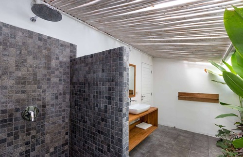Two bedrooms are furnished with queen beds while the third is furnished with four bunk beds that is an ideal setup for kids. The bedrooms all come with en-suite bathrooms and air-conditioners. The master bath even has a terrazzo bathtub along with outdoor shower under a pergola roof that is common with all ensuites.