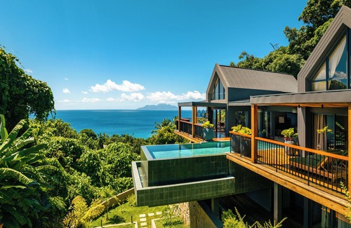 A holiday dream comes true with this exclusive villa for couples, friends and families! The very spacious, luxurious Maison Gaia has an absolutely fantastic location in the north of Mahé, on the local west coast, and offers a unique panoramic view of the Indian Ocean and the neighbouring island of Silhouette. The tropical green surroundings and enormous granite rocks form a picturesque setting for the elegant building, which has been harmoniously integrated into the landscape.
