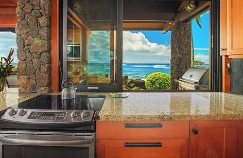 This extraordinary 4 bedroom, 4 bathroom luxury home is one of the finest Kauai oceanfront rentals on the island. The grand entrance opens to expansive cathedral ceilings showcasing the magnificent oceanfront living areas surrounded by tropical atriums, lava rock pillars and specialty woodwork. Glass walls and custom floor-to-ceiling sliding glass doors invite the gentle sounds of rolling surf into this impressive Poipu Beach vacation home. The extended shoreline lanai features a heated swimming pool, a rarity among Kauai accommodations. Depending on the season and tide, you may find a small protected sandy cove bordering the tropically landscaped yard.