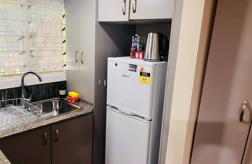 The space features its own separate kitchenette with a fridge and freezer, stove, microwave, toaster electric kettle and the needful for a self contained kitchen. Outdoor laundry has a washing machine and clothes line.