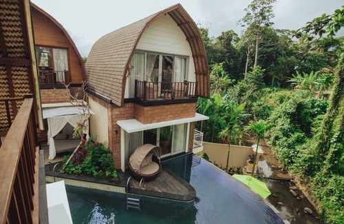 Incorporate modern and Balinese architecture design, the villa is inspired by the Traditional rice barn called ‘the lumbung’ which is firmly built with the calming wood element. The living room on the ground level is adapting an open living concept completed where the plunge pool and long river pool are attached to its terrace, while on the upstairs, the bedroom is perfectly set in the wooden curved roof with the balcony allowing more privacy.